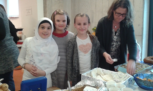 Ella, Tijda und Belinay aus der Klasse 2a zeigten ihren Gästen ihre fantasievollen Schildkröten-Collagen. Und Linus und seine Klassenkameraden der 2b waren verantwortlich für die Puppenkollektion aus Stoff und Pappmaschee. Kreativität auf einem anderen Gebiet bewiesen viele Eltern: Sie hatten die Mensa zum appetitlich bestückten Galerie-Café gemacht und boten Kuchen, Salate und internationale Spezialitäten an.